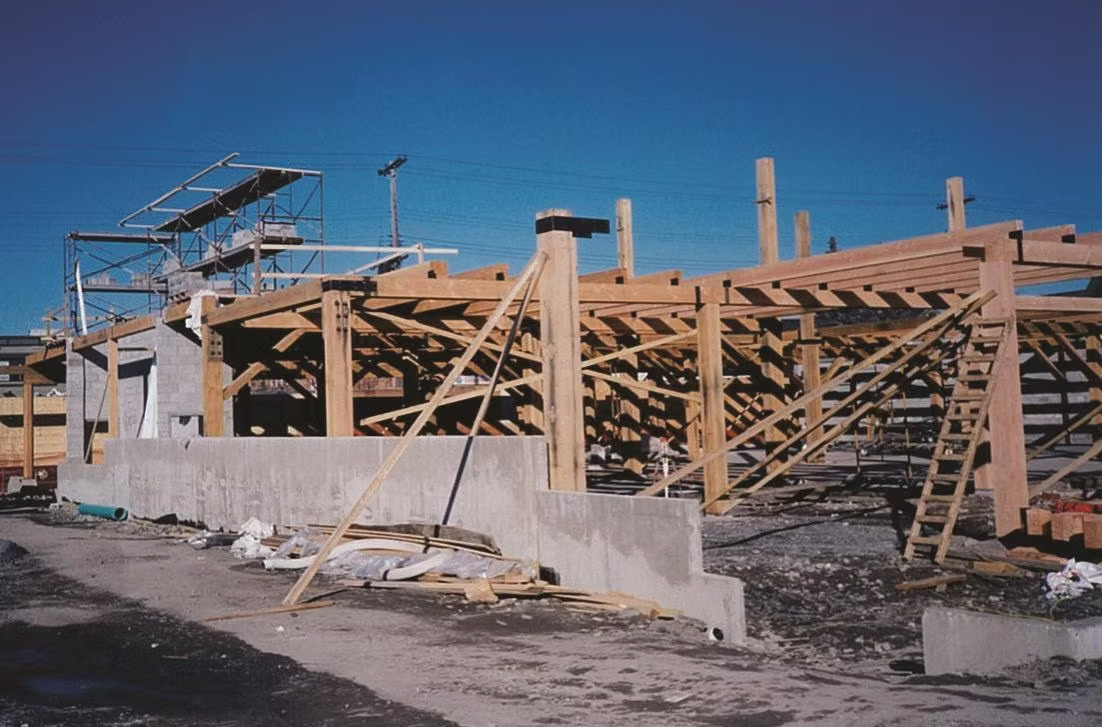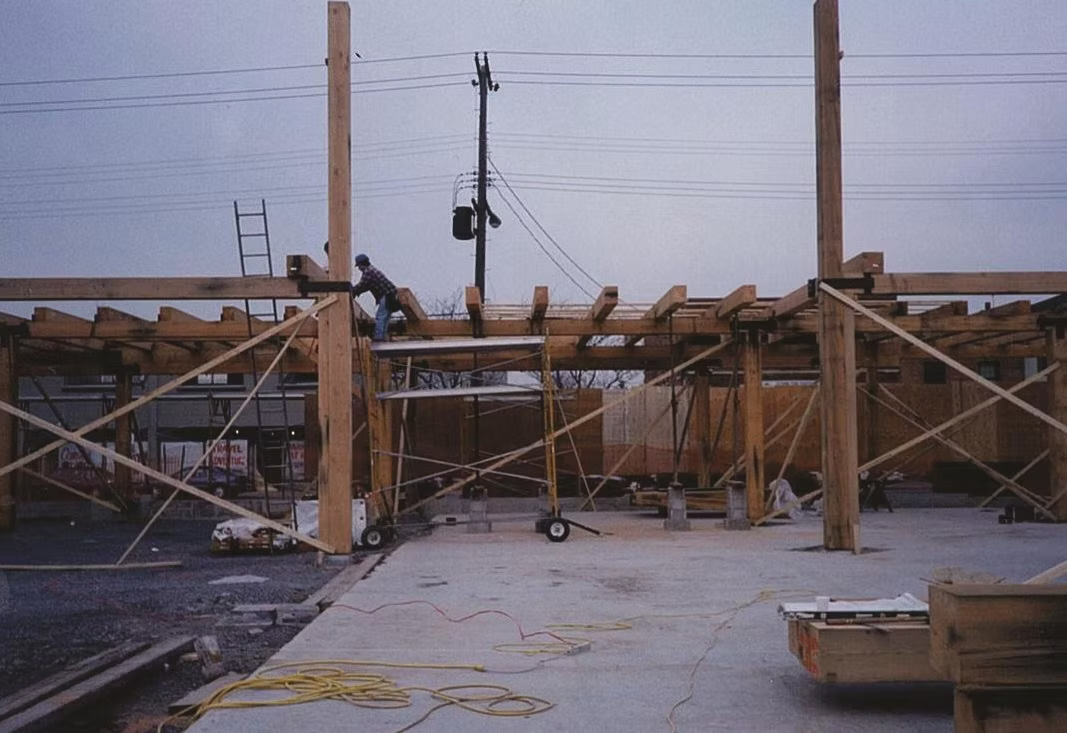 In September of 1999, David Lyman was hired by Justice Construction Ltd. to accept responsibility to fabricate and erect a 14,000 sq. ft. recycled timber framework for Mountain Equipment Co-op at 366 Richmond Road in Ottawa.